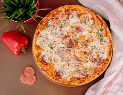 Русская пицца. Соус для пиццы, сыр Моцарелла, салями, перец Болгарский, соус сырный, лук красный, укроп.