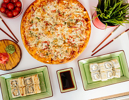 Ролл сливочный окунь, жаренный ролл Темпура Чикен, пицца Святогор 30 см.